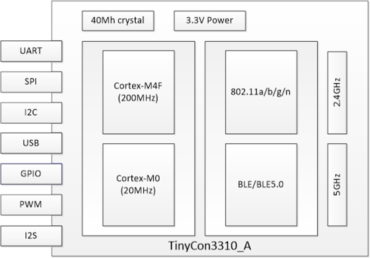 TinyCon3110是一款基于SoC方案WiFi/BLE/BLE5.0芯片設(shè)計(jì)的WiFi模塊,既能夠提供了便捷的網(wǎng)絡(luò)接入功能,同時(shí)也能夠提供了強(qiáng)大的控制功能。它包含一個(gè)ARM Cortex KM4的MCU,一個(gè)KM0的MCU,支持802.11b/g/n 1T1R的射頻,提供大量的外設(shè)接口,可以讓您的開(kāi)發(fā)更靈活。芯片支持外置大功率PA,發(fā)射功率可達(dá)23dbm。TinyCon3110是一個(gè)完整的WiFi解決方案,可以獨(dú)立運(yùn)行完成接入網(wǎng)絡(luò)、控制單元;也可以作為slave搭載在其他host端完成所有操作。